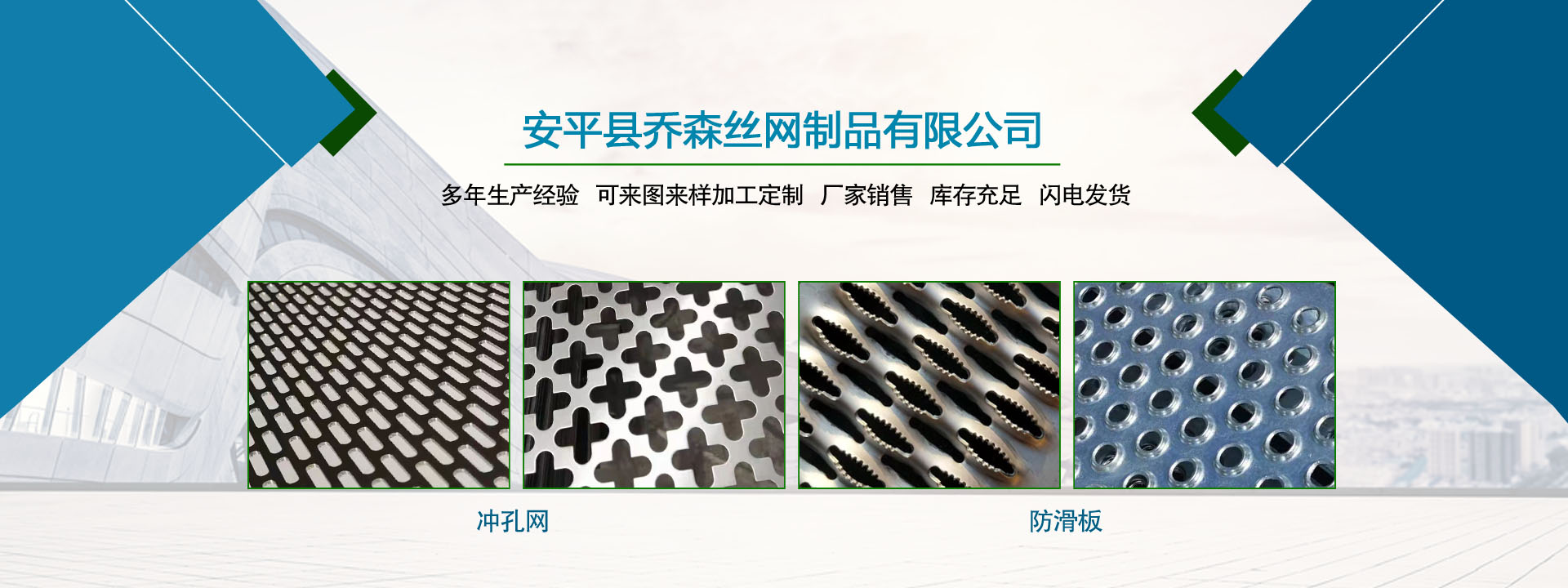 喬森絲網(wǎng)成立于2014年9月,位于中國絲網(wǎng)之鄉(xiāng)-河北省安平縣,是一家專注于生產(chǎn)金屬絲編織網(wǎng)、金屬網(wǎng)板沖孔及相關(guān)金屬裝飾絲網(wǎng)深加工產(chǎn)品的企業(yè)。從一個家庭式的小工坊到公司多年來,一直本著以“質(zhì)量求生存,信譽謀發(fā)展”的生產(chǎn)原則兢兢業(yè)業(yè)穩(wěn)步向前,贏得了 一大批忠實客戶的廣泛贊譽。然騏驥一躍,不能十步,駑馬十駕,功在不舍。我們將以更周到的服務,更過硬的質(zhì)量,不忘初心,為廣大的客戶提供更優(yōu)質(zhì)的服務。